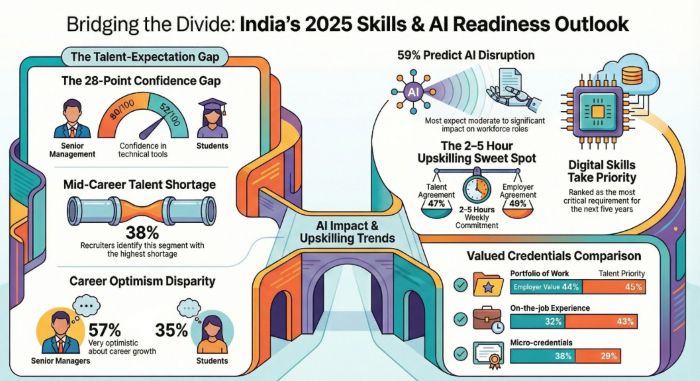 The study draws responses from 2,800 students and working professionals ranging from early jobbers to senior management and 700 recruiters, CXOs, senior leaders and academic heads, spanning industries such as IT/ITeS, BFSI, manufacturing, healthcare, e-commerce, EdTech, government, FMCG, telecom and auto.