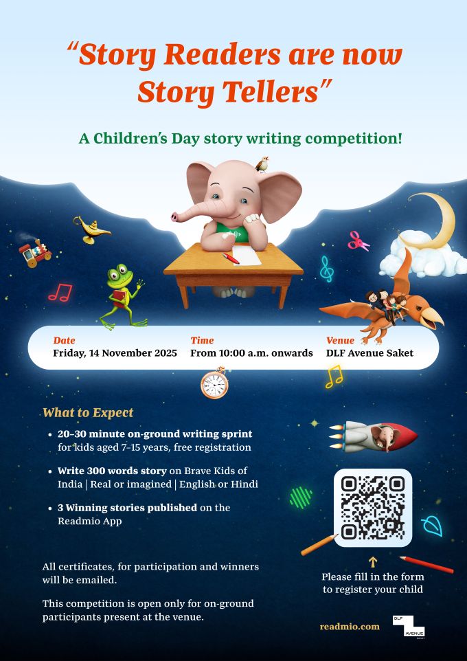 This Children’s Day, Readmio, the storytelling app joins hands with DLF Avenue Saket in Delhi for “Story Readers are now Story Tellers” — a one-of-a-kind on-ground story-writing celebration that nurtures creativity, confidence, and imagination in children.